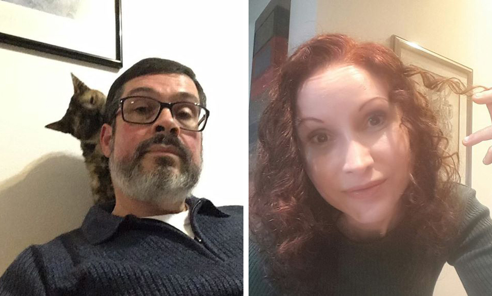 Natalia Pasternak showing off her Double-Helix hair, and Carlos Orsi with his cat, Violet.