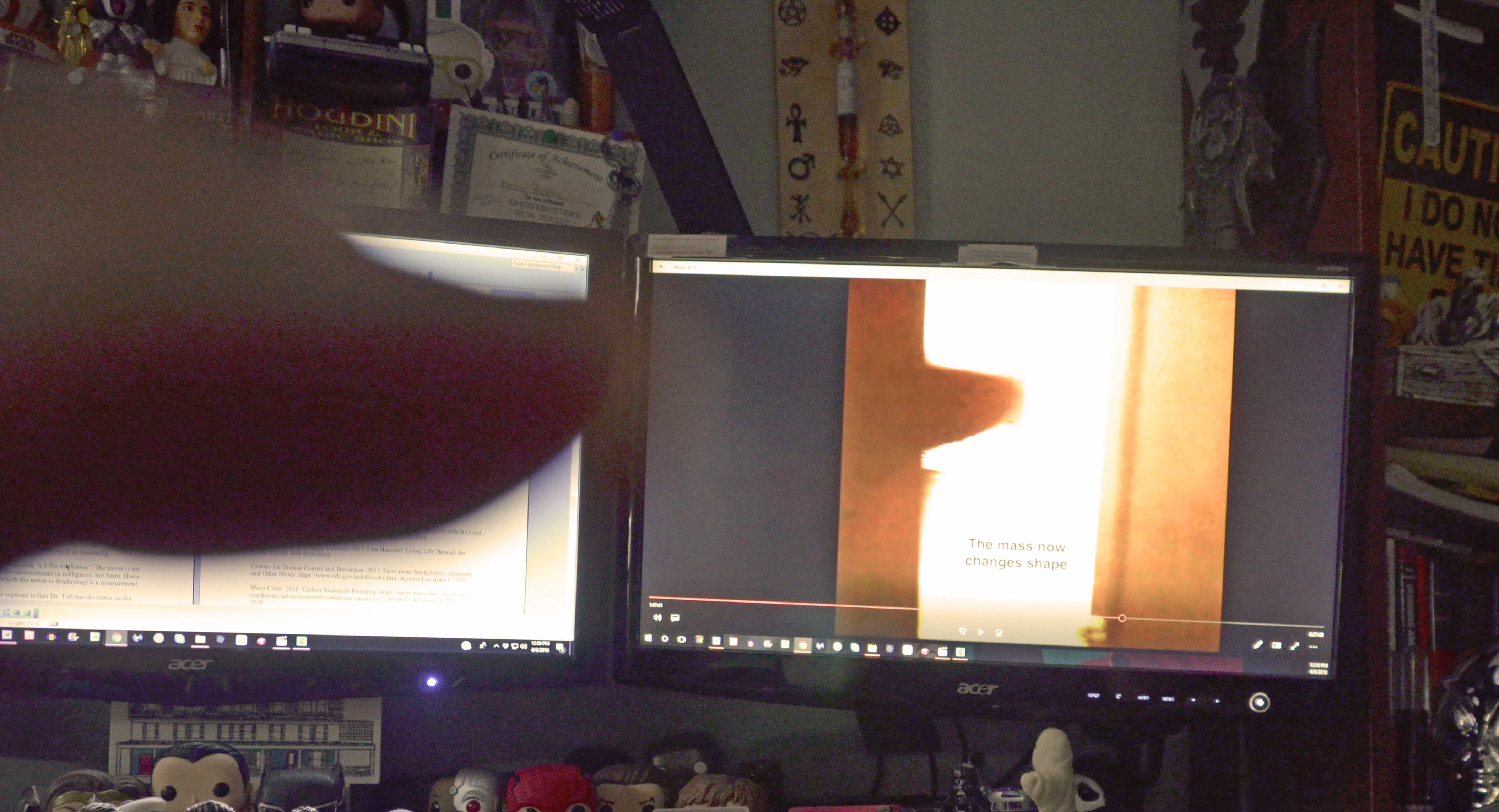 Screenshot of author’s recreation of the black mass while viewing the black mass on monitor. That is not his thumb; it’s his fingers lumped together in front of the lens.