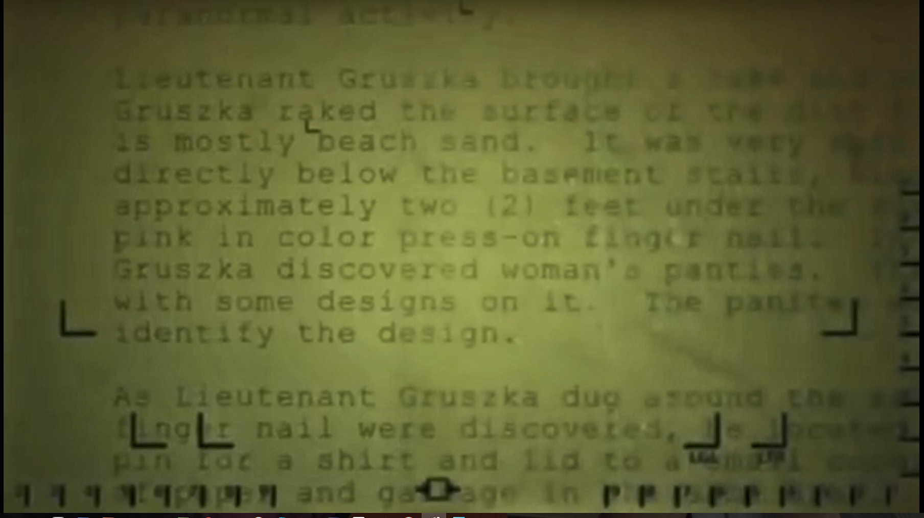 Cut-scene showing document detailing several items that were found under the basement stairs, including a pin to a shirt, a lid, and garbage.