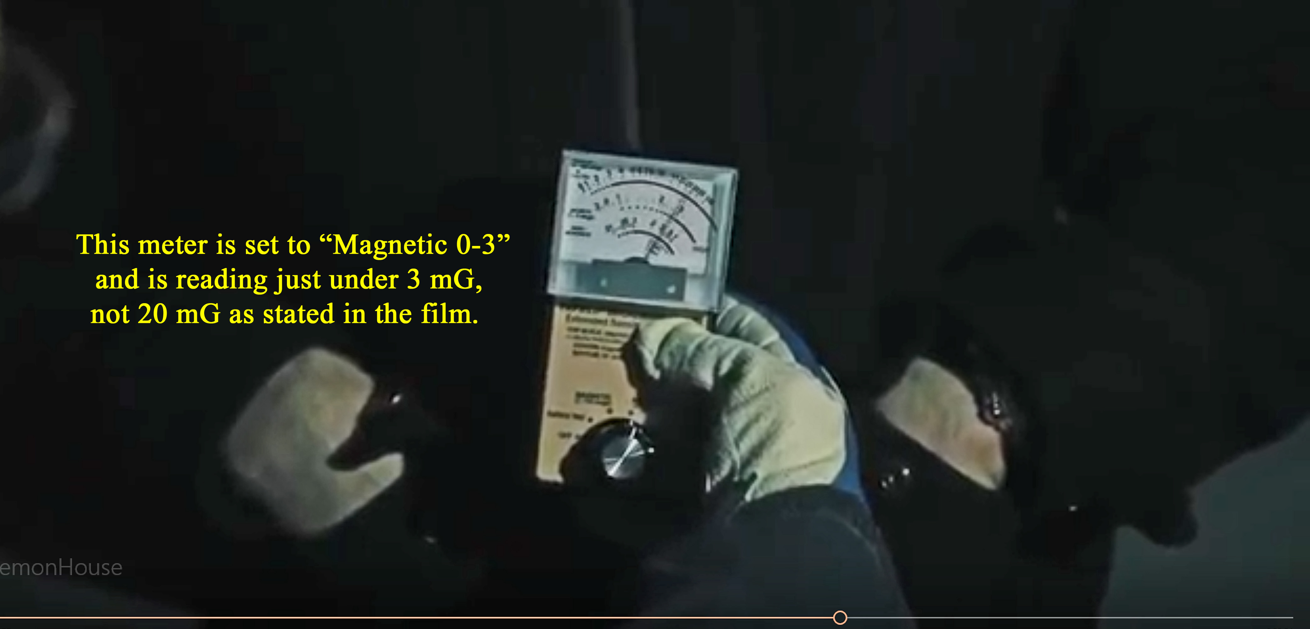 Lee also mentioned that high level fields, such as those around 20 mG, could produce an audio hum that could be heard on audio recordings (such as professional camera equipment used for a ghost hunting film). Another scene has the cameraman complaining about getting “crazy interference” at one point. If they were actually getting a high reading—and we don’t know, since they were on the wrong scale—this is a plausible explanation for the interference.3
