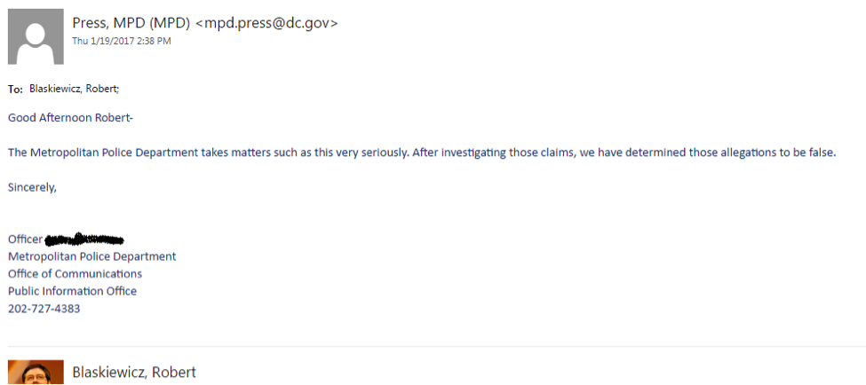 “The Metropolitan Police Department takes matters such as this very seriously. After investigating those claims, we have determined those allegations to be false.”