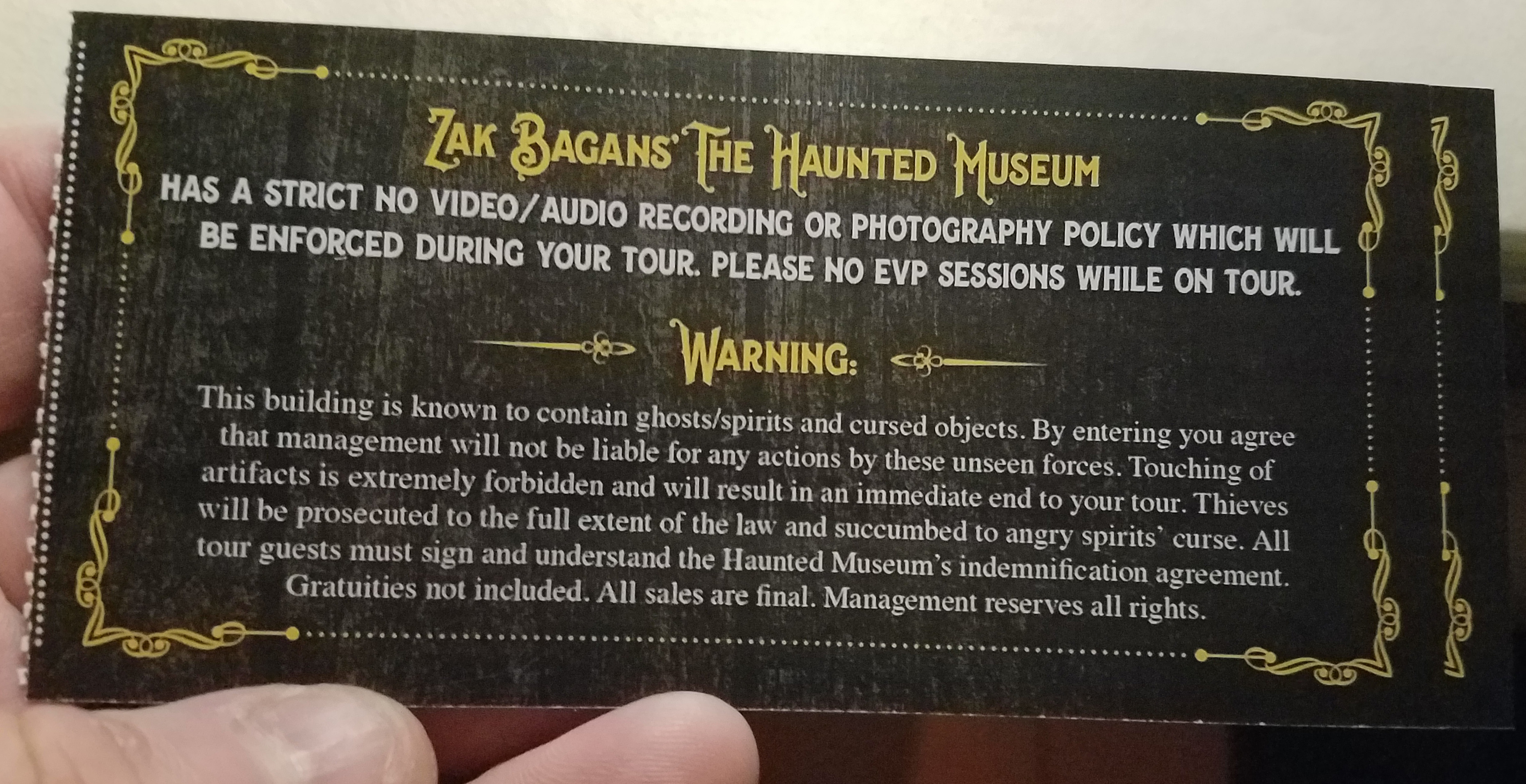 The waiver also allows the staff to take photos of guests to be used in “any or all publications and websites.” However, they were sure to repeat ad nauseam about their strict policy of “No Video/Audio Recording or Photography.” We were told several times while waiting in line, it’s printed on the back of the ticket, there were signs up in multiple locations, and the first of too many guides reminded us of this as her cheerful smile turned into a serious and stern look of “You Better Listen or Else.” Also, no ghost hunting was allowed—sorry, ghost hunters. You’re out of luck. We were also informed that no phone calls or texting was permitted during the tour.