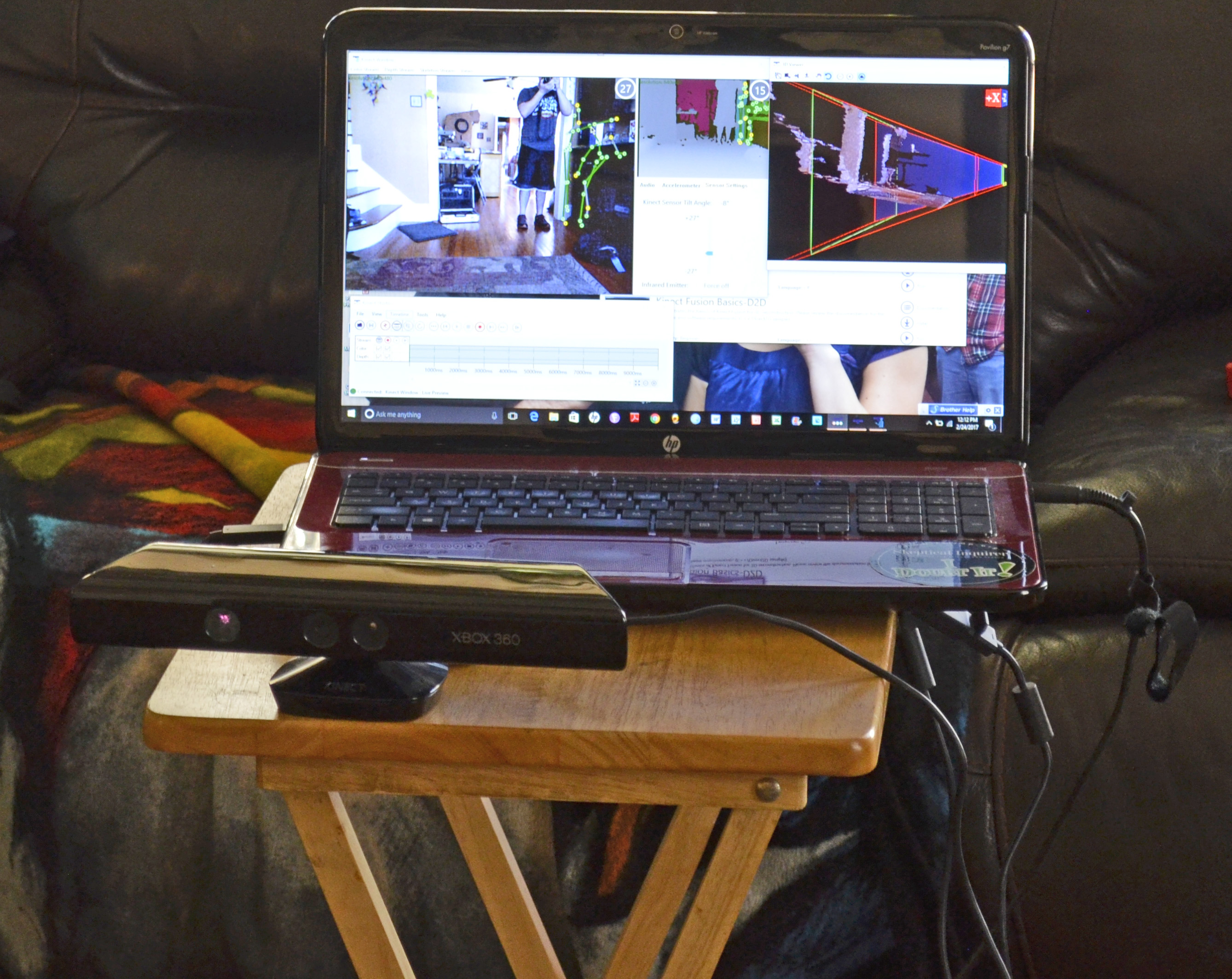 The Kinect plugged into my laptop. It has assigned two distorted stick figures to my entertainment center and archway yet has ignored me standing there.