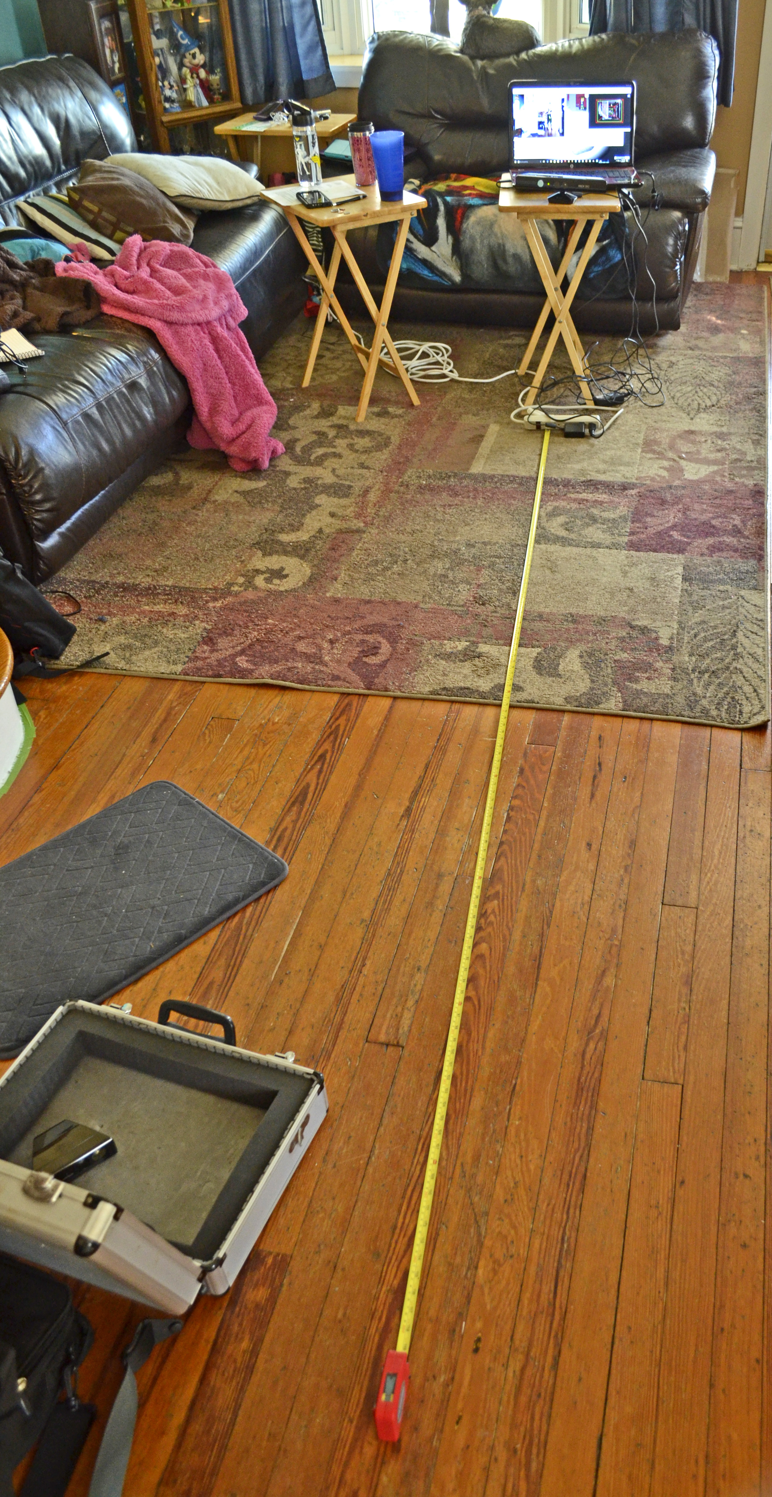 Tape measure showing a distance of ten feet from the Kinect. This is the distance it was still picking me up as a player, as well as the entertainment center and vacuum cleaner.
